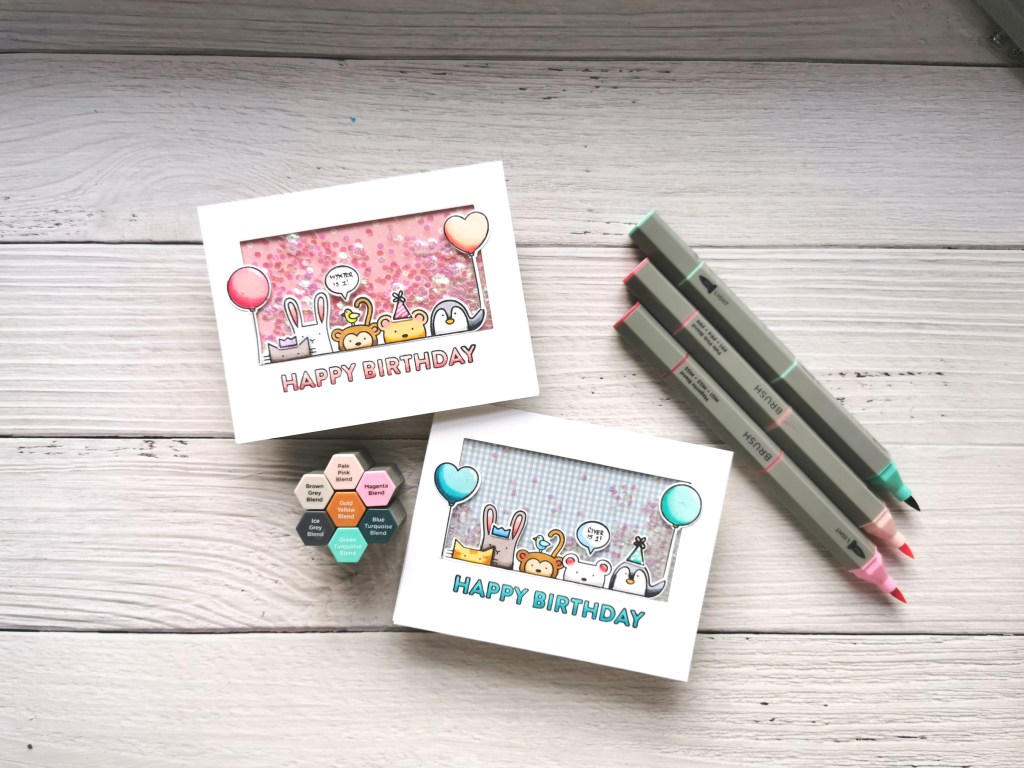 How cute is this stamp set? It’s called Critter Crowd by Simon Says Stamp. I started by stamping two sets of the critters, plus the balloons and party hats, and coloured them using my Spectrum Noir Tri-Blend markers. These are amazing, they take the guesswork out of blending and shading for those of us who are new to the game! Once coloured, I die cut the images on my Gemini Mini, using the co-ordinating dies.