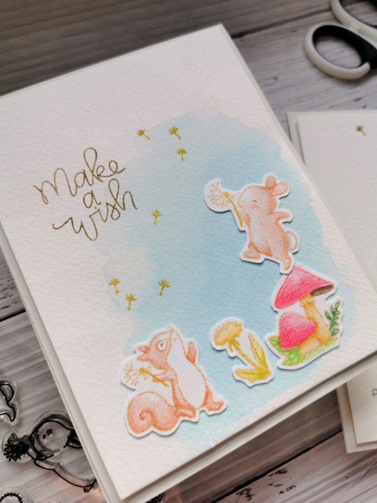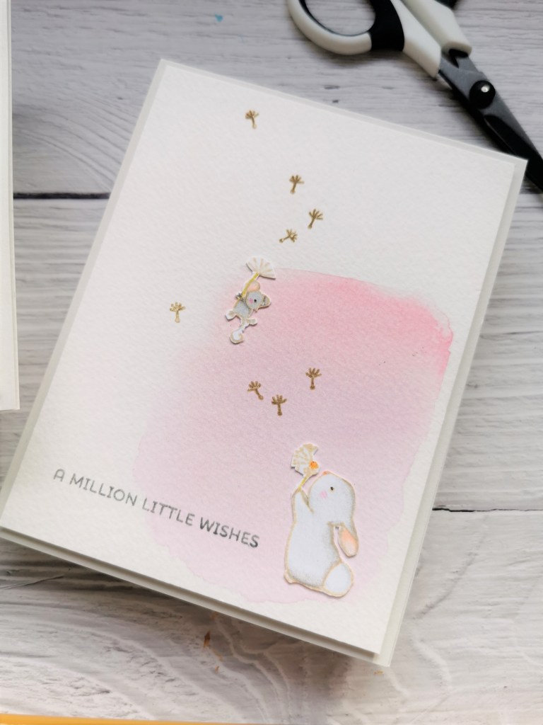 For these cards, I stamped out all the images from Mama Elephant’s Dandelion Wishes stamp set using Antique Linen distress ink, because I wanted a very pale outline so I could do some “no line” colouring. I coloured the images using Arteza coloured pencils. It was the first time I’ve really used them properly and tried to do shading, and I’m quite pleased with how they’ve turned out!