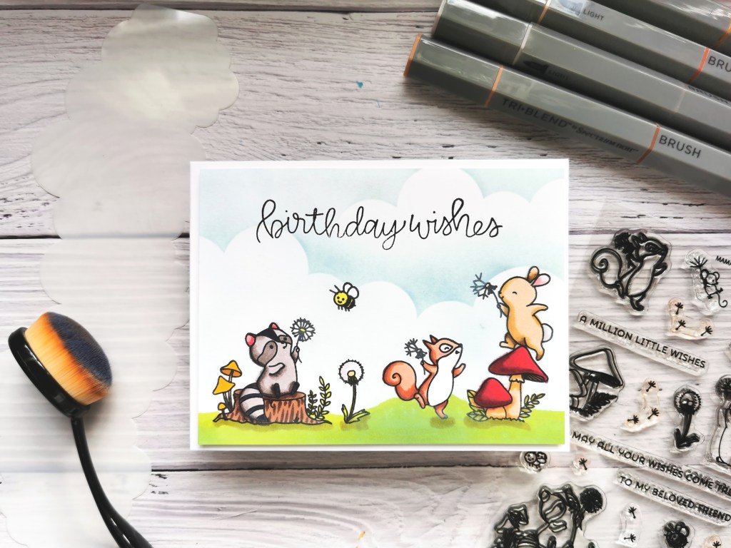 I used my trusty Spectrum Noir Tri-Blend markers to colour the little critters, and then I applied the mask over the top so I could ink blend the background.
