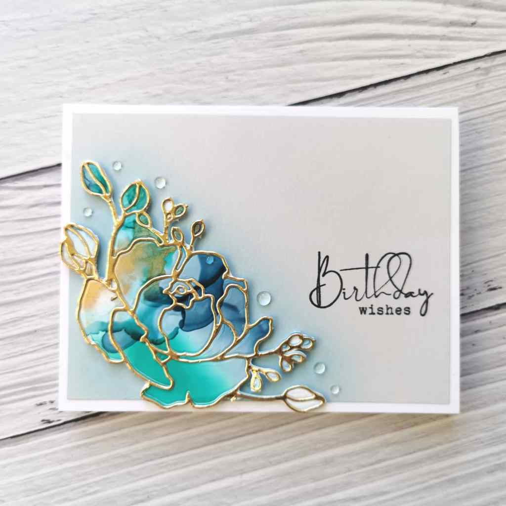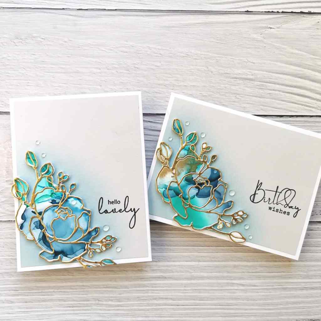 I used the Fine Bouquet die from Altenew and cut two flowers. Before removing them from the metal die, I put glue on the back, then pressed them down onto some scrap card, so the pieces stuck to the card in the right position when I poked them out. I then cut another flower from gold card and just used the outline piece to adhere over the alcohol ink flower.
