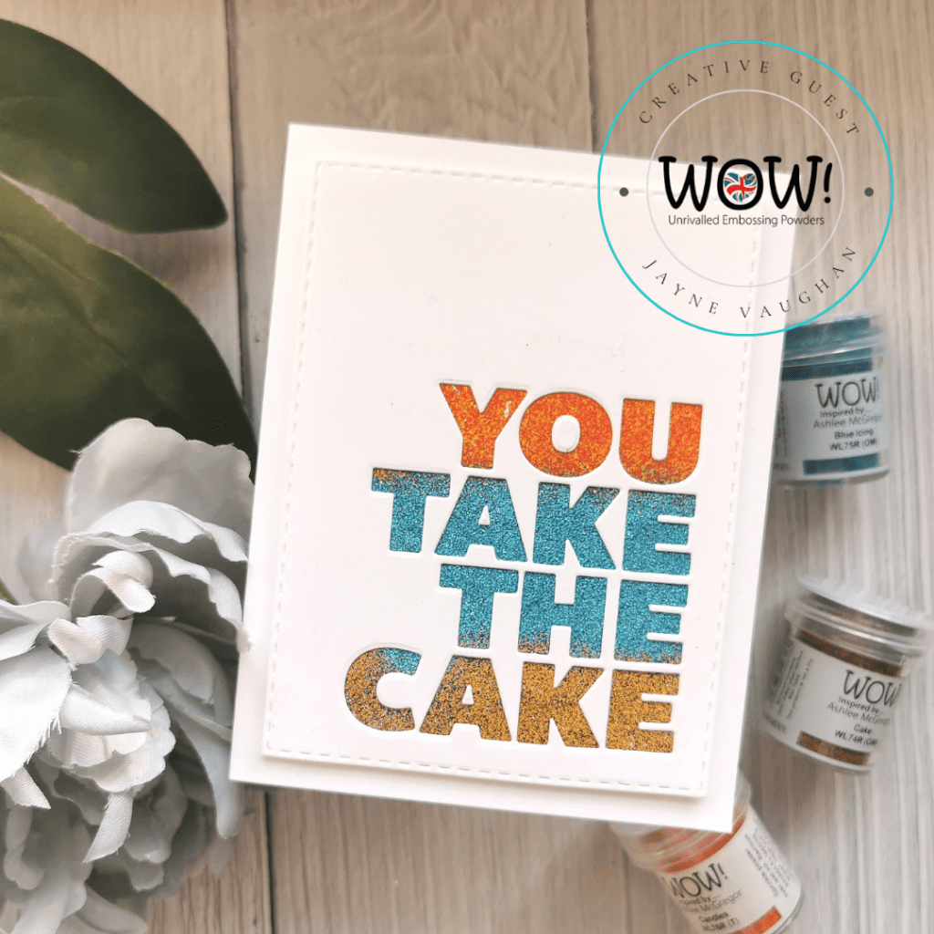 I cut a piece of card big enough to cover the sentiment, and applied Wow! Embossing ultra slow drying embossing ink to the entire panel, and sprinkled each of the three colours from the Birthday Cake Trio in rows over the panel. I heat set the powders with my heat gun, then attached the embossed panel to the reverse of my rectangle panel, so that the embossing could be seen through the sentiment.