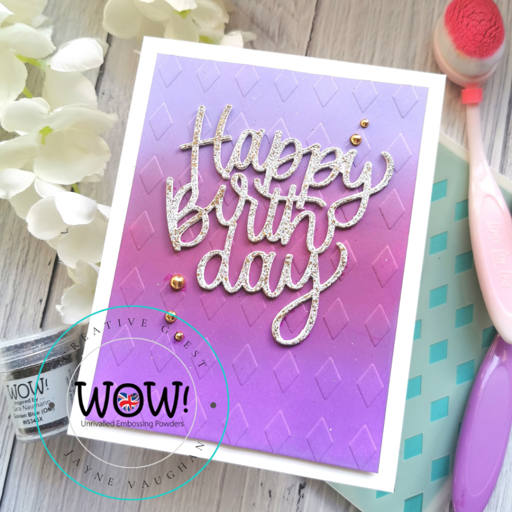 Next up, I created my own glitter cardstock by covering a piece of card in Wow’s ultra slow-drying ink, then adding Golden Blue embossing glitter and heat setting. I die cut the Happy Birthday sentiment from the glitter panel, and also two more from plain cardstock, to stack them together for some nice dimension. I adhered the sentiment to the front with liquid glue, then added some gold pearls from Pinkfresh studio to finish.