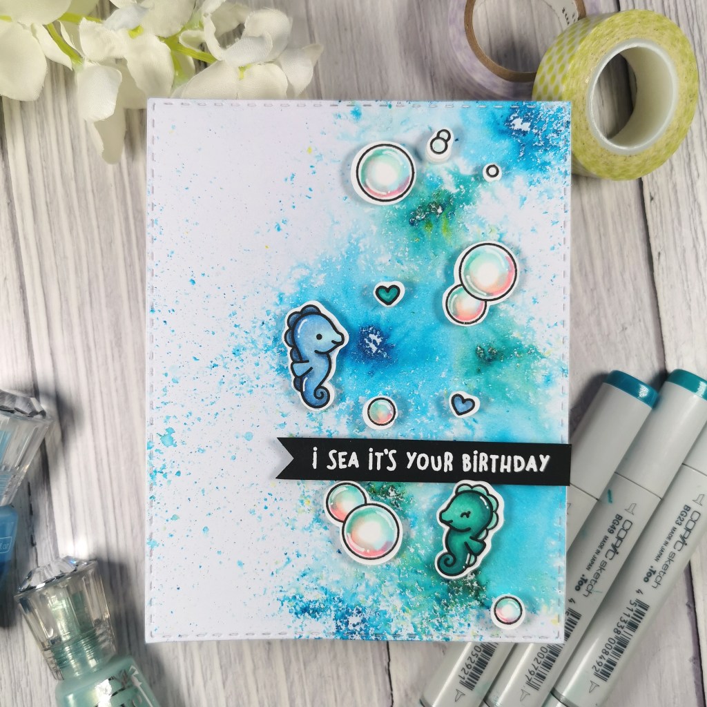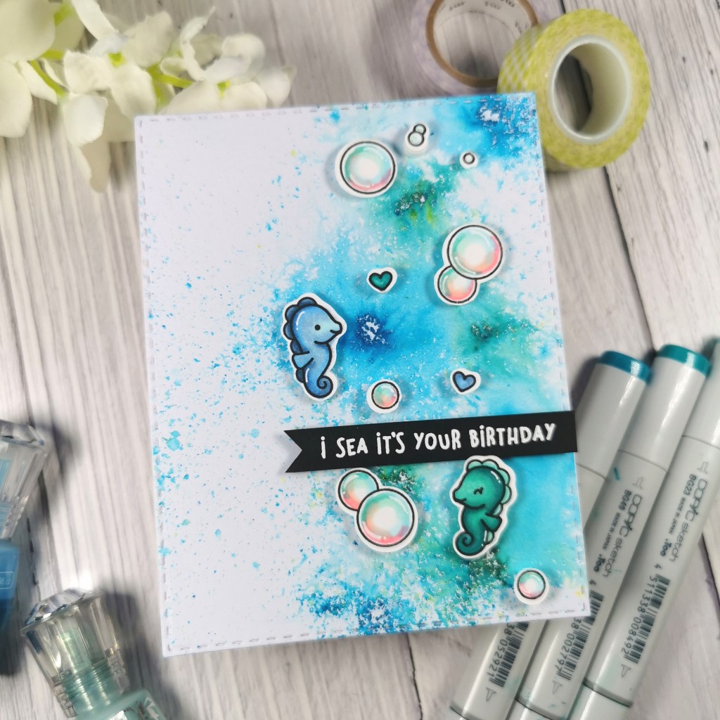 I stamped, coloured and fussy cut the seahorses and hearts, and some of the bubbles from the Scripty Bubbles stamp set.