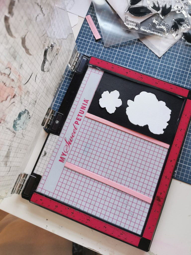 I used the Painted Peony stamp and die sets from Concord & 9th, die cut each of the shapes in scrap card to make my jig, then followed Jennifer’s process to stamp all the layers of the flowers. In one lunch hour, I made enough florals for 6 cards.