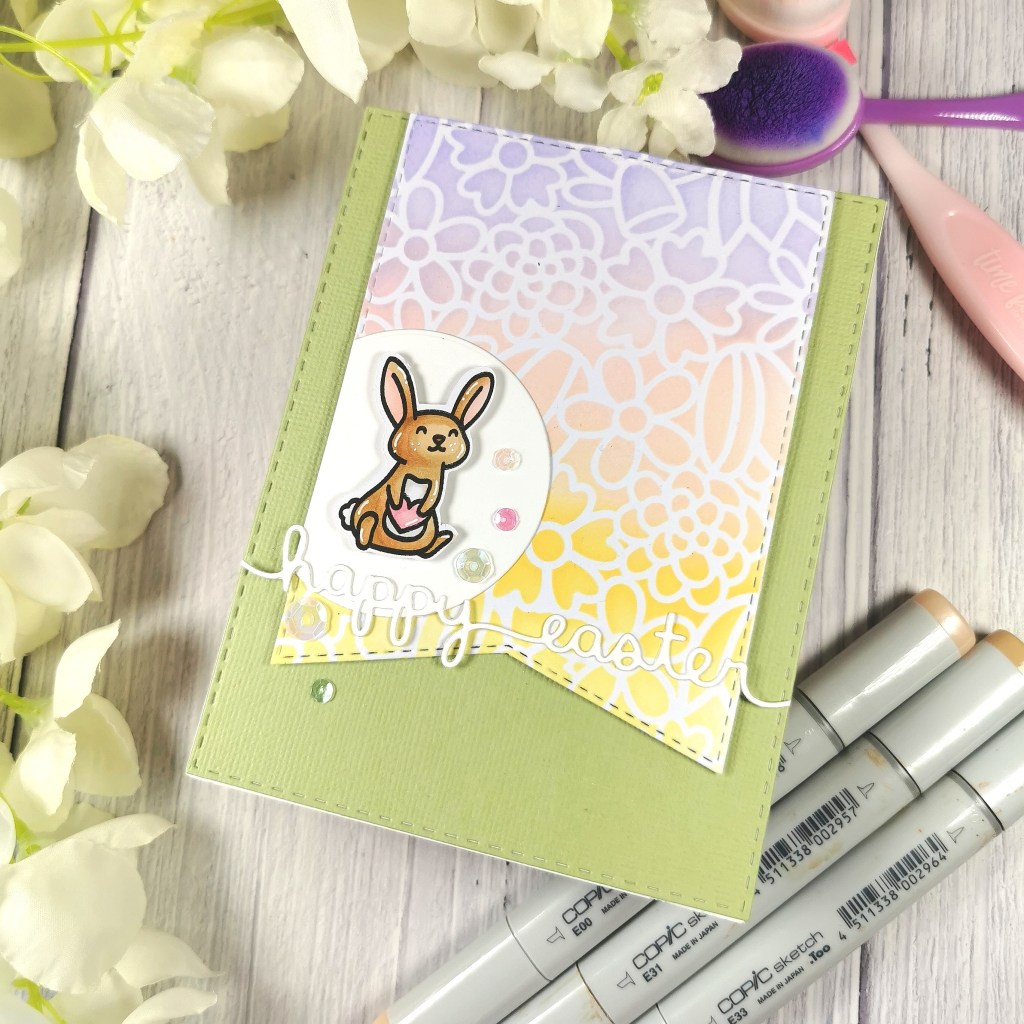 For my second card, I ink blended a background panel in the same way, and die cut it to just smaller than A2 size using the same stitched nesting dies from Pink and Main. I coloured up a second bunny and added him to another white die cut circle, as before.