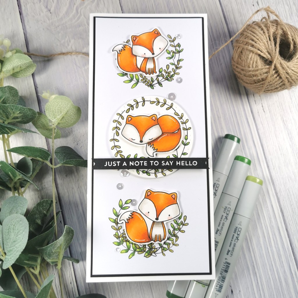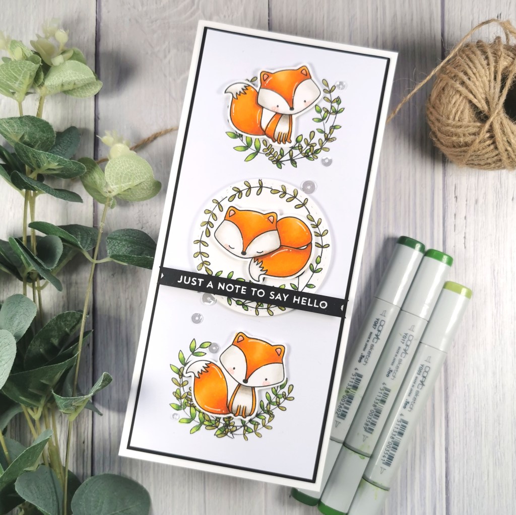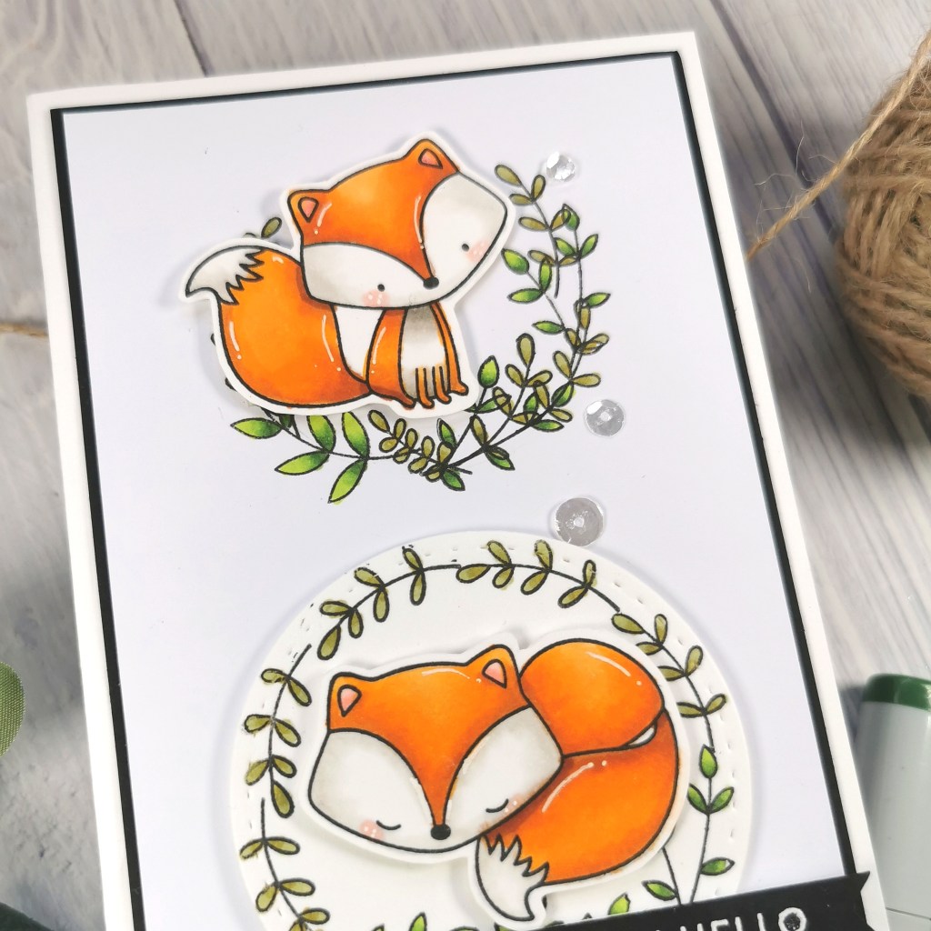 I actually had some foxes already stamped and coloured from the MFT Let’s Curl Up stamp set, so I used those and then did some free range stamping to create some circular shapes using the small foliage stamps from the set. I coloured the foliage with Copics.