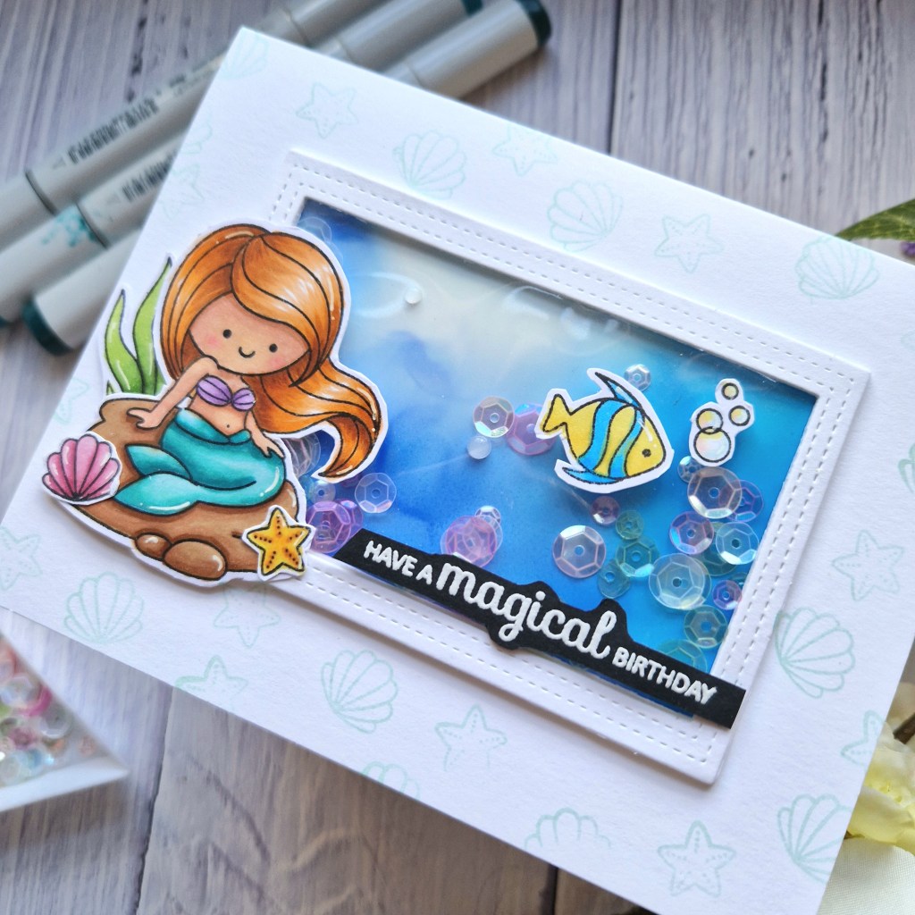Another weekend, another kids party for my 4 year old!! The birthday girl is big into princesses, so I decided to make her a magical shaker card using the Fairytale Mermaid stamp set by Clearly Besotted, featuring a mermaid that I coloured up like Ariel.
