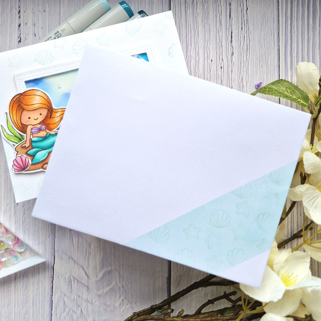 I decided to make a matching envelope, so masked off the envelope flap with Heffy Doodle tape, added some Sea Glass ink with a blender brush, then again stamped the starfish and seashell over the top. I did the same with a stripe masked off at an angle on the front of the card.