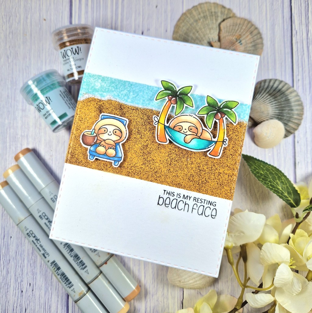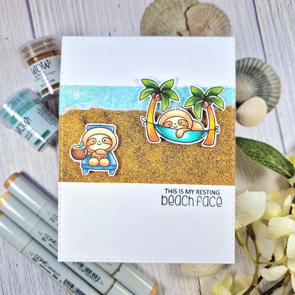 To make my background, I masked off the top section of my A2 white card panel, and applied some Wow embossing ink below it. I added some Wow Clear Ocean embossing powder and heat set to make the ocean. I then masked off the bottom section of the card and added some Wow Cake embossing powder between the masking paper and slightly overlapping the ocean, then heat set to make the sandy beach.