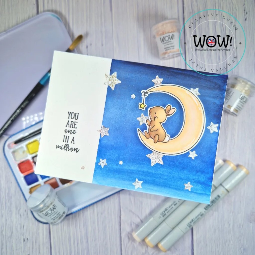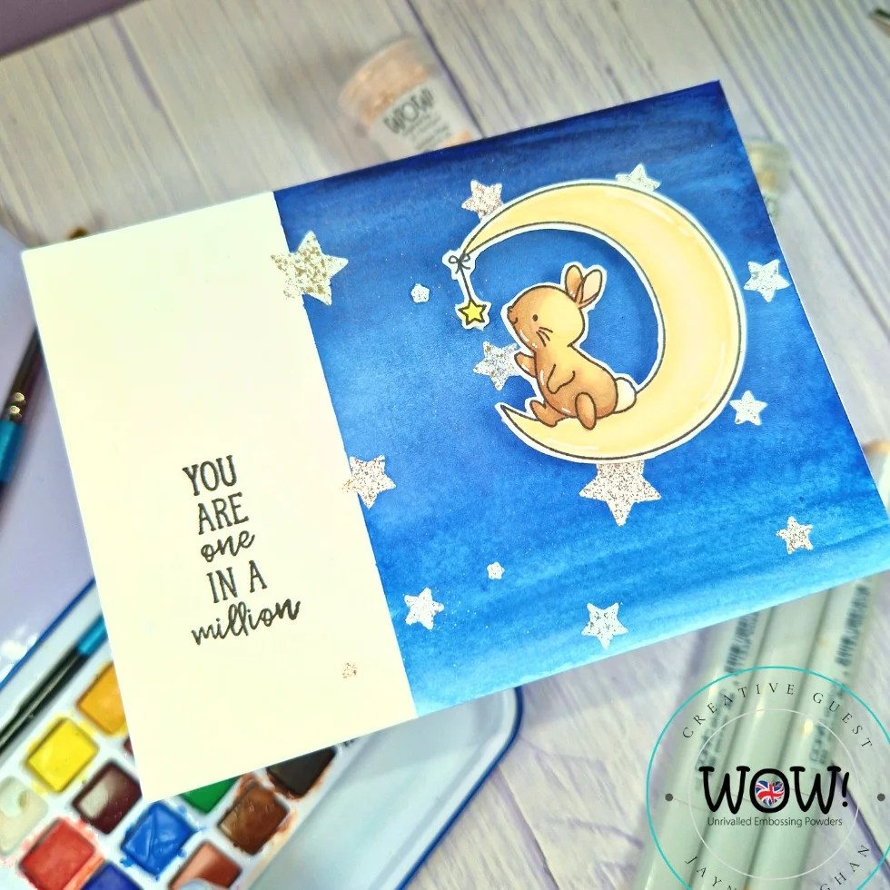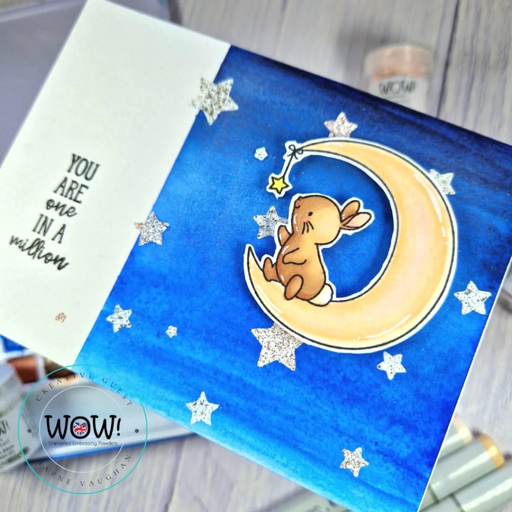 I then stamped, fussy cut and copic coloured the bunny on the moon, and added to my background with foam tape.