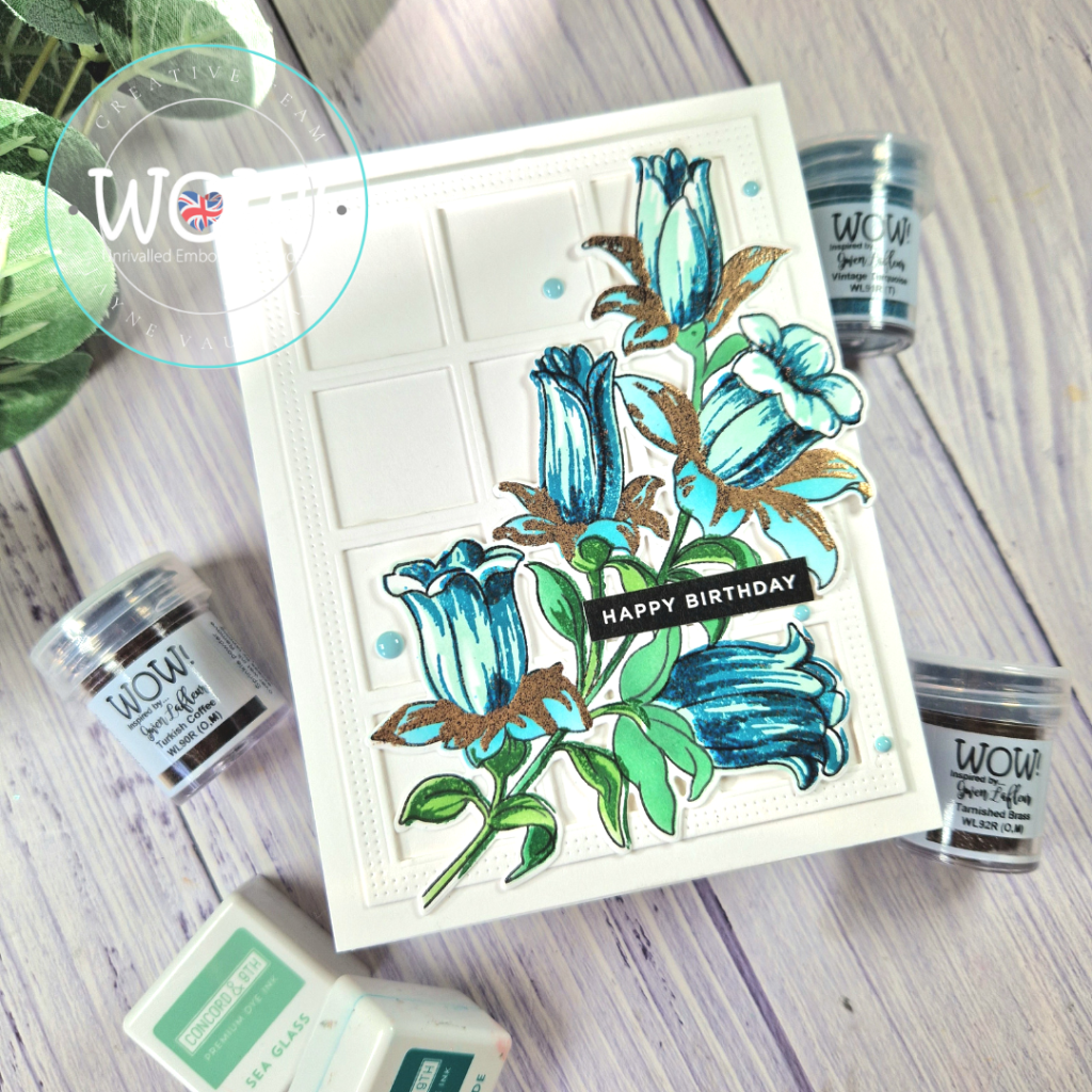 I stamped the outline image in black ink, then added colour to the petals with the layering stamps. The colours I used were Concord and 9ths Sea Glass and Oceanside. For the final detailed stamp, I used Wow embossing ink and added the Vintage Turquoise powder, which I then heat set.