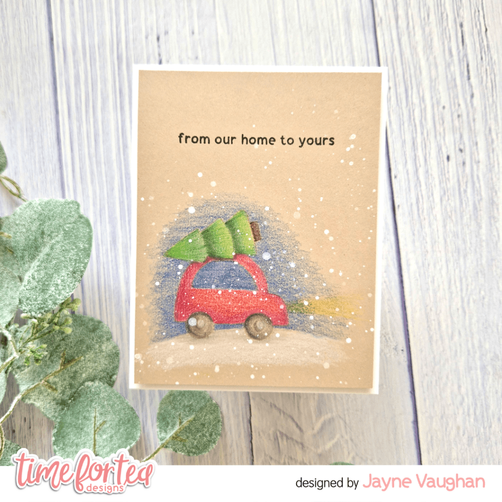 I cut a panel of kraft cardstock to 5” x 3.75” and stamped the tree image from the set in Antique Linen distress ink. I then masked it off and stamped the car over it, so when the mask was removed, it looks like the car is carrying the tree. I used Arteza pencils to colour the image, much in the same way as I would colour with Copics – I started with darker colours in the areas where there would be shadows, and moved to lighter tones.