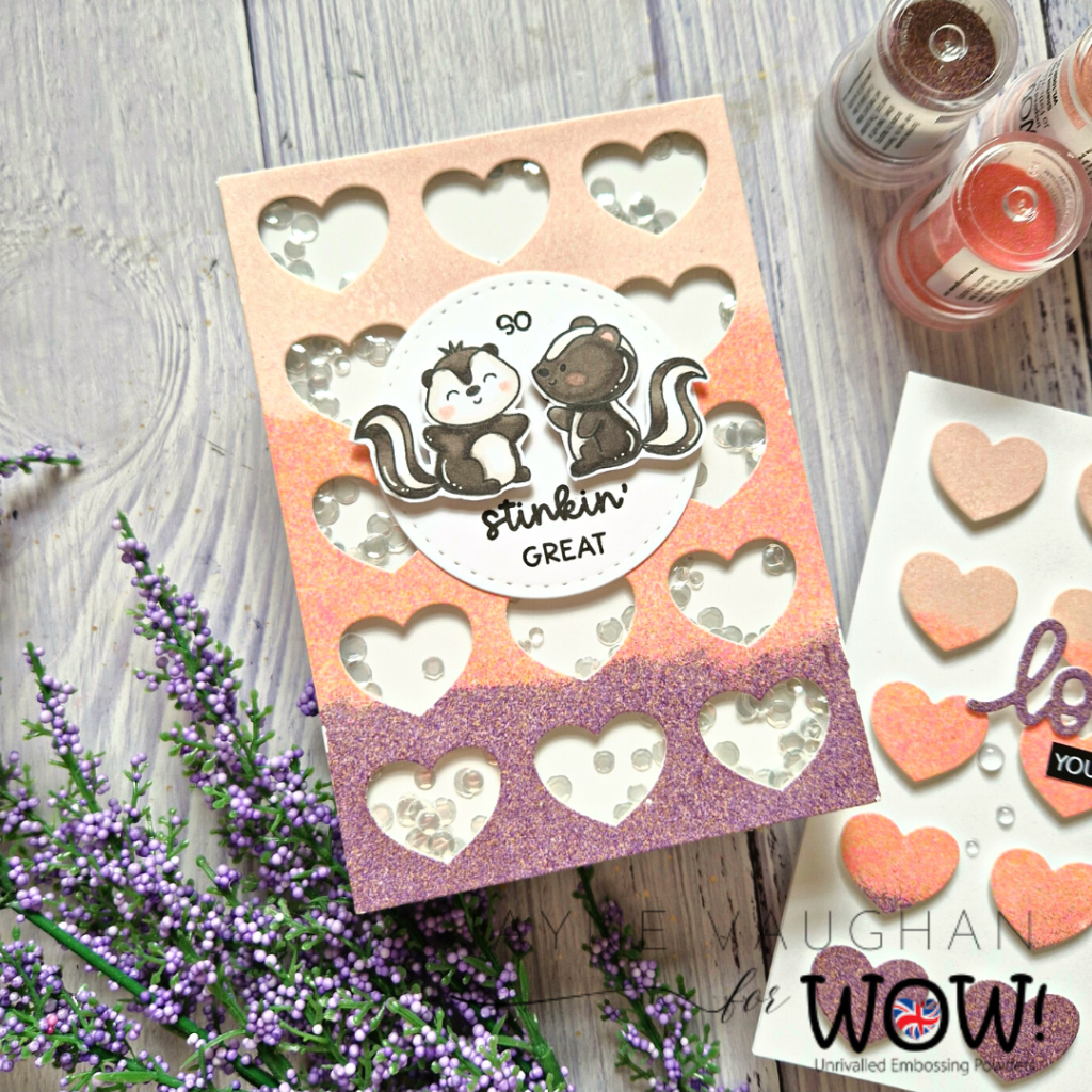 I used the Sweetie Jar Trio from Wow! Embossing’s latest release to create an embossed panel. I covered some white cardstock with Wow’s embossing ink, then sprinkled each of the colours from the trio (Sherbet Fizz, Marshmallow Fizz and Plum Fizz) over the panel. I set the powders with my heat gun to create a lovely, shiny background panel.