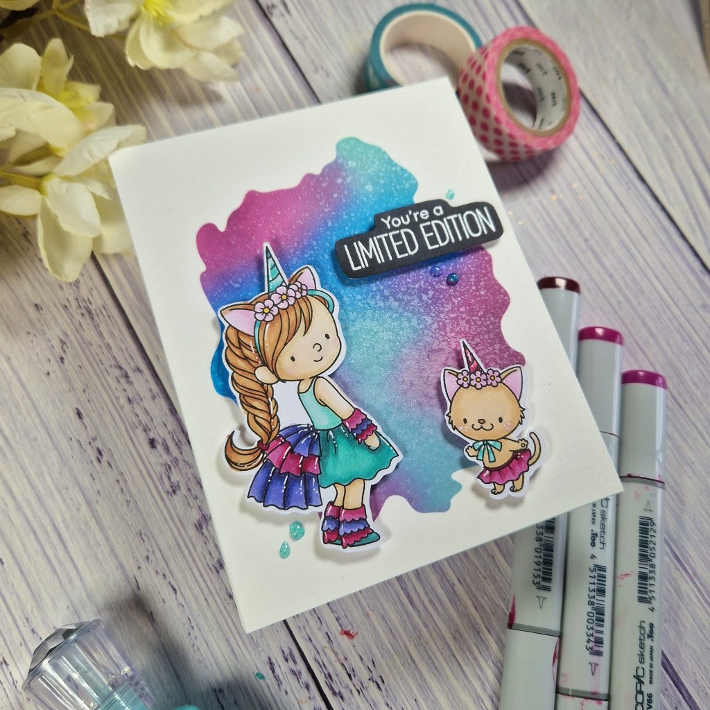 I then stamped, coloured and fussy cut two of the images from MFT’s Unicorns and Glitter stamp set. I used MFT’s Extreme black ink, which is Copic friendly, and coloured them with the following Copic markers: