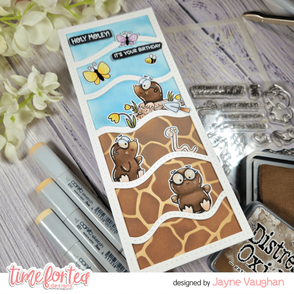 Above the centre line, I ink blended a pale blue sky with Tumbled Glass distress oxide. I laid out the moles and worm that I’d stamped, die cut and coloured with Copics, where I wanted them on my card, and adhered them to the background with liquid glue, I then glued the frame to the background, which helped me figure out where to place the mole above ground, the daffodils, bee and butterflies (which were from another new release set – Daring Daffodils).