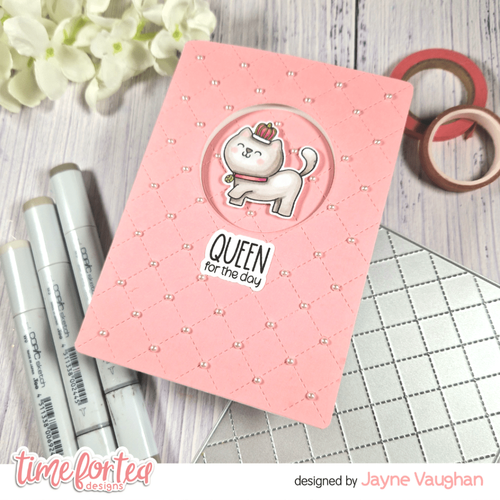 When I saw the kitties with their crowns in the Queen for the Day stamp set, I immediately pictured one of those quilted, luxurious cushions, and so I set out to make a card that replicated that look.