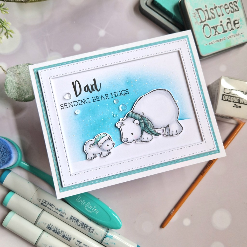 It’s Father’s Day on Sunday here in the UK, so I chose to make a card for my Dad using the RAM Beary Special stamp set. I stamped, fussy cut and coloured my images using Copic markers. Next, I made my background by lightly ink blending some Peacock Feathers distress oxide onto some white card. I sprinkled over some water to add texture, then flicked over some opaque white paint by Copic.