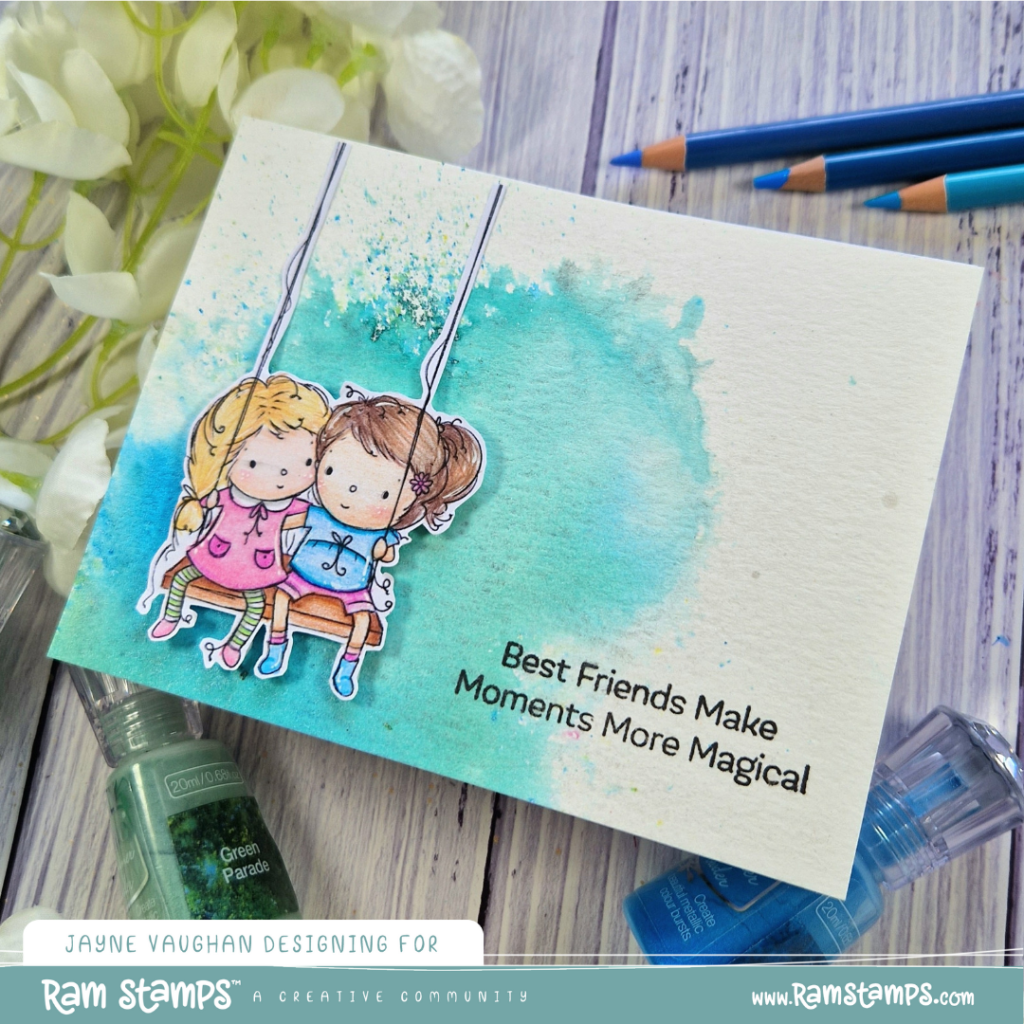 Hey crafty friends, thanks for joining me today! I have a video up on my YouTube channel today, showing how I made this watercolour background card featuring a sweet little image from RAM Stamps called “Swinging Friends – Girls”.