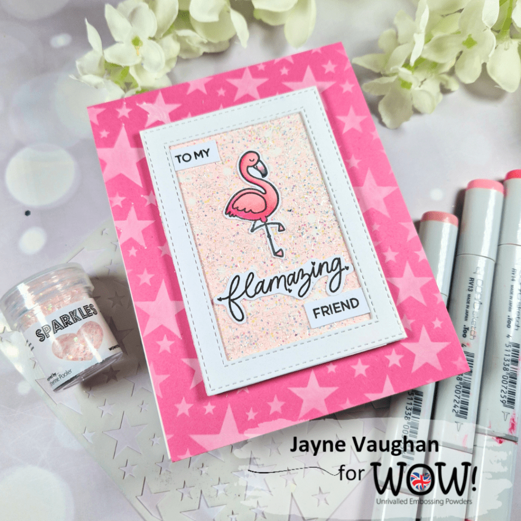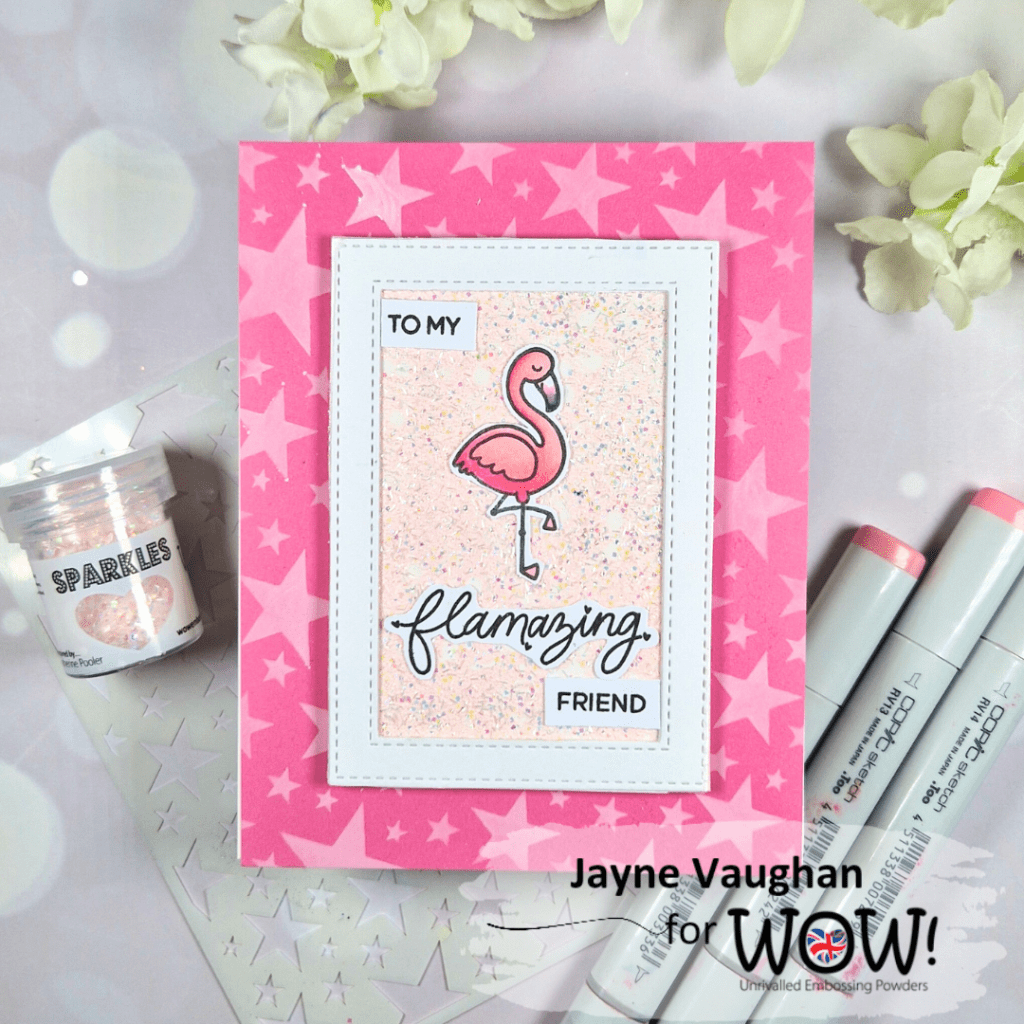 Hey guys, there’s a new mini release today at Wow Embossing! It’s a brand new, super fun colour of Sparkles called Cotton Candy – pink with irridescent glitter and sparkles. As soon as I swatched it, it reminded me of flamingoes! Which was a great opportunity to raid my stash and use the Flock Star stamp set from Heffy Doodle I’ve been wanting to break out!
