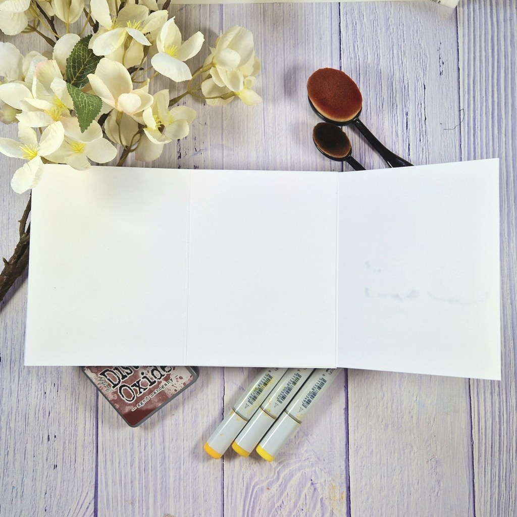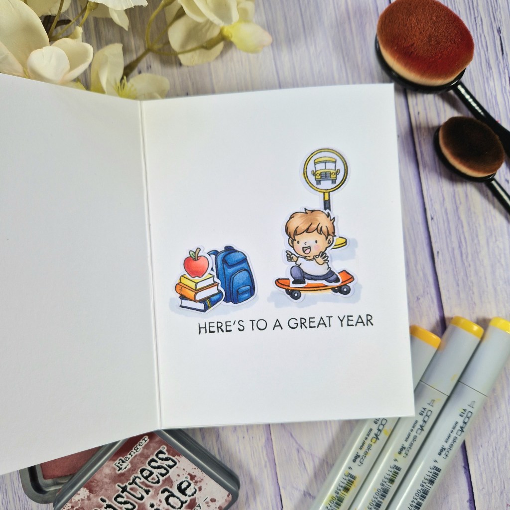 To create the tri-fold card, I glued a second A2 sized card to the inside of the first (so the fold of the second card is on the right hand side). I then added the bus stop sign, the boy and his school stuff, to the middle section of the card, and stamped the sentiment underneath. This leaves the very inside of the card blank to add a nice message.