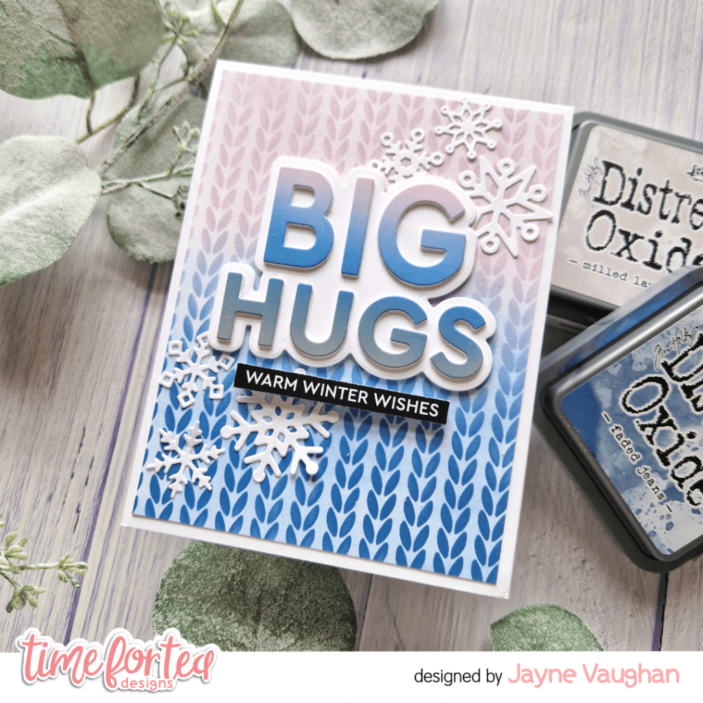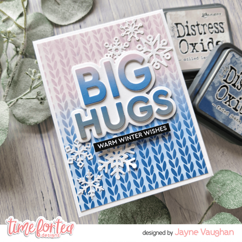 I started by ink-blending my background – I used the Cosy Sweater stencil and ink blended milled lavender and faded jeans distress oxides, overlapping them in the middle to create a new purpley-blue colour. At this point, I didn’t like how stark the white card looked against the sweater pattern when I removed my stencil, so I ink blended a light amount of the same colours over the top.