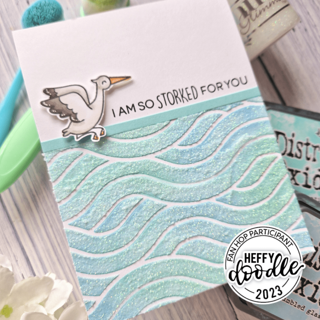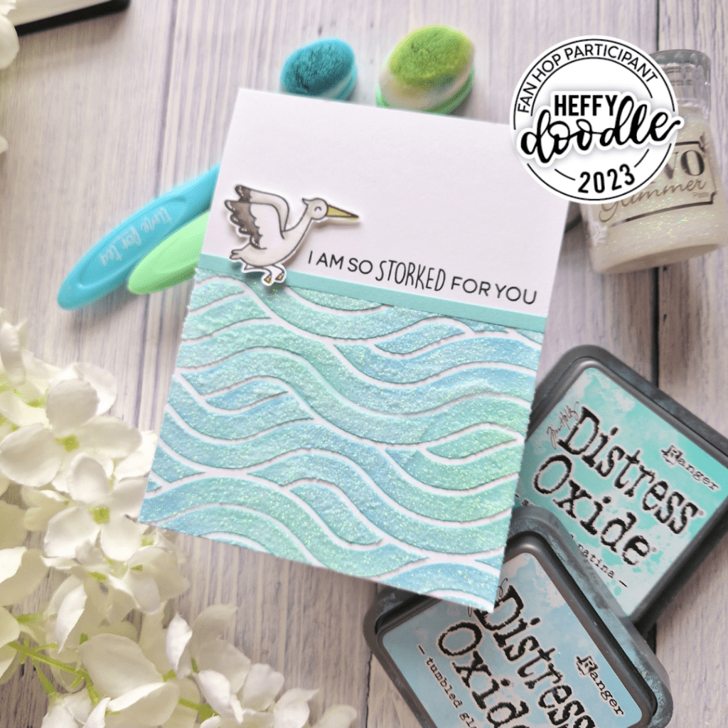 Next, I cut a slim strip of Aqua Sky cardstock and glued it above the stencilled area. I stamped the sentiment in black Versamark ink, then added the stork with foam squares.