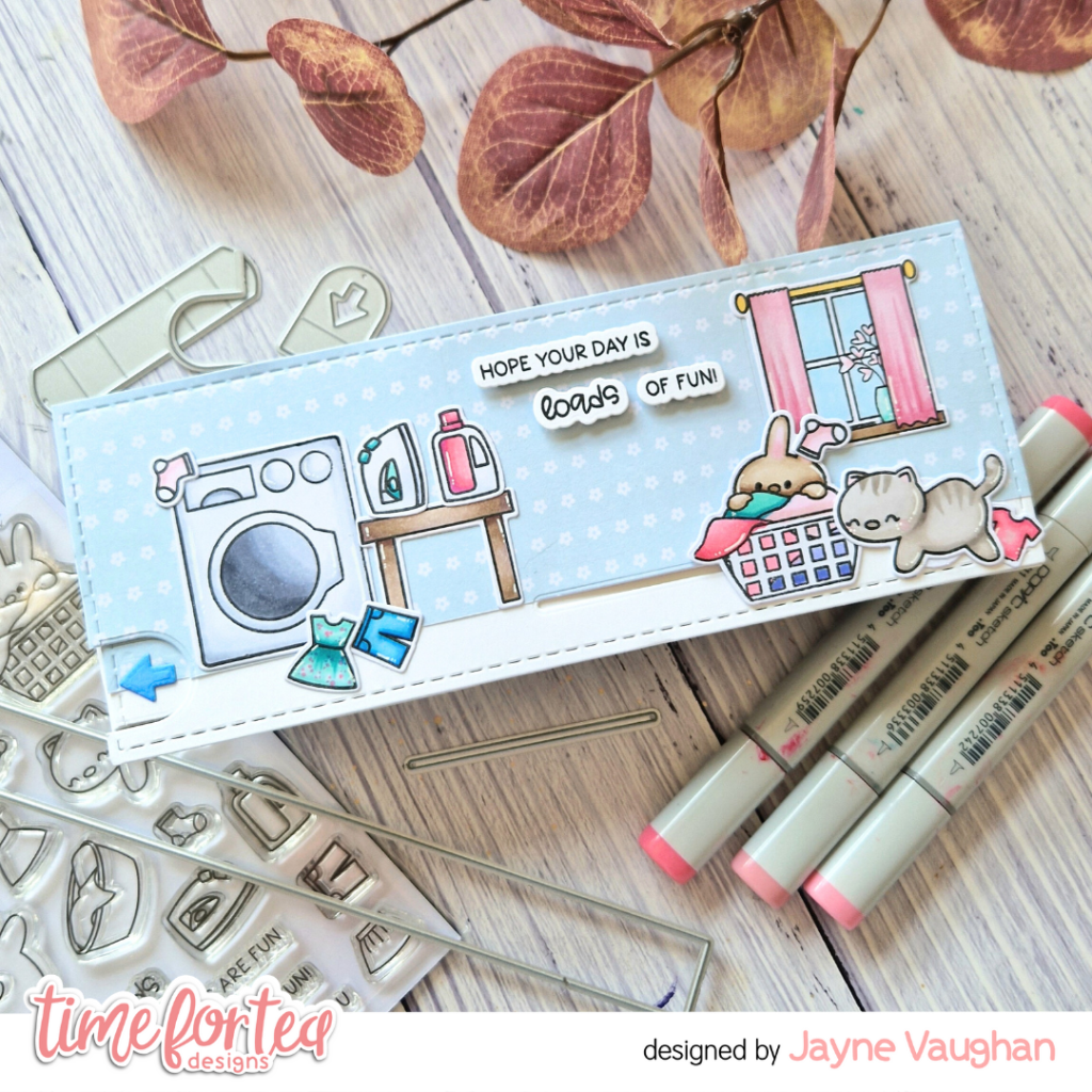 Hey friends, hope you’re all enjoying summer. We’ve just gotten back from our family holiday, and I have three weeks worth of laundry to get through – so I thought this card was quite apt for today! This card also makes me smile because it was inspired by my two daughters (age 3 and 5) who love to be pushed around in the laundry basket!
