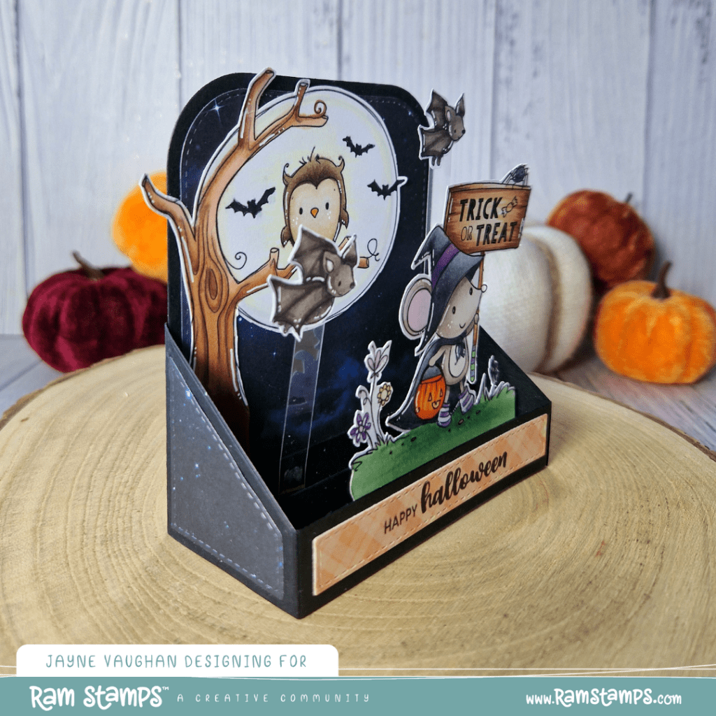 Hey friends, how are you? I thought I’d share another Halloween card that I made with this month’s RAM Stamps release. I love a good box card, so I decided to combine a couple of digital stamps to create my 3D scene.