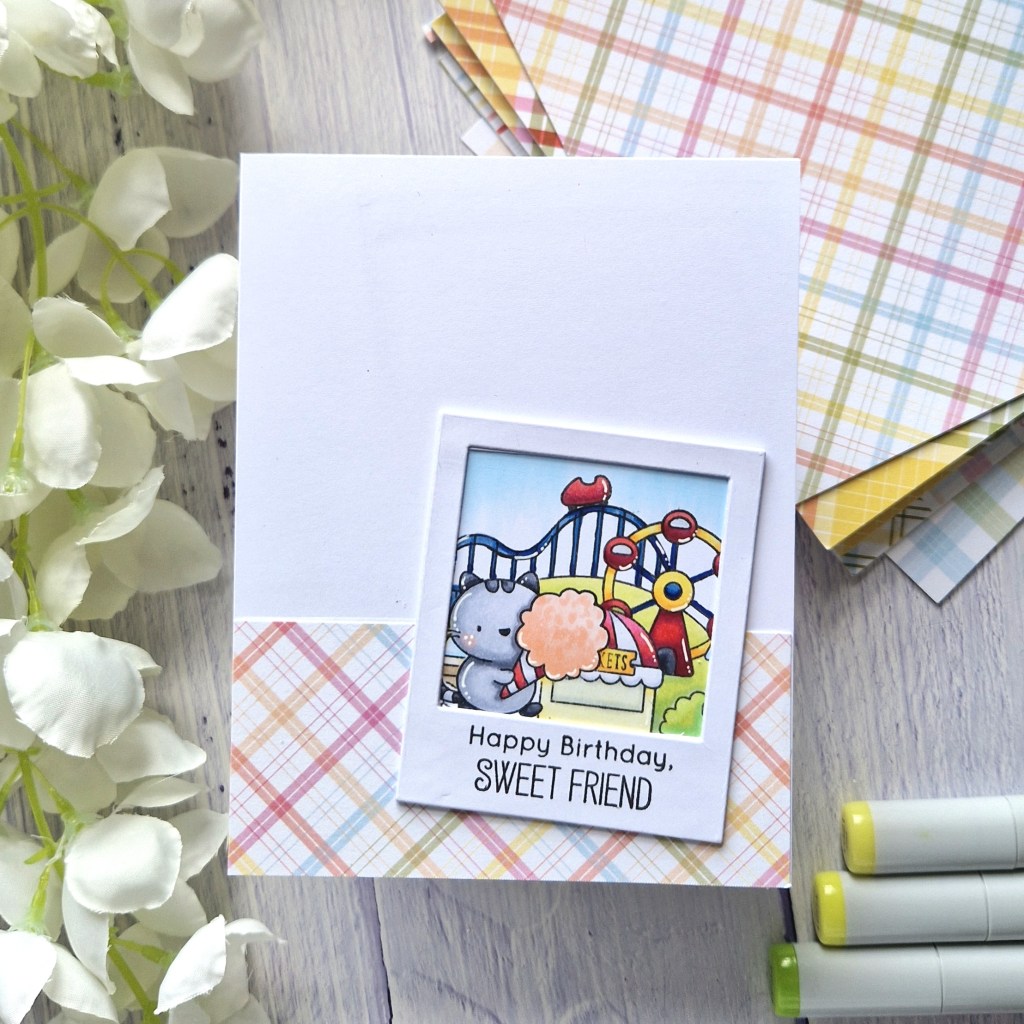 I created a scene using the MFT Carnival Critters stamp set. First, I stamped out the kitty with the candyfloss, then masked the image off (I just used memo tape), and stamped the carnival scene behind it. I removed the memo tape, then coloured the image with Copics.