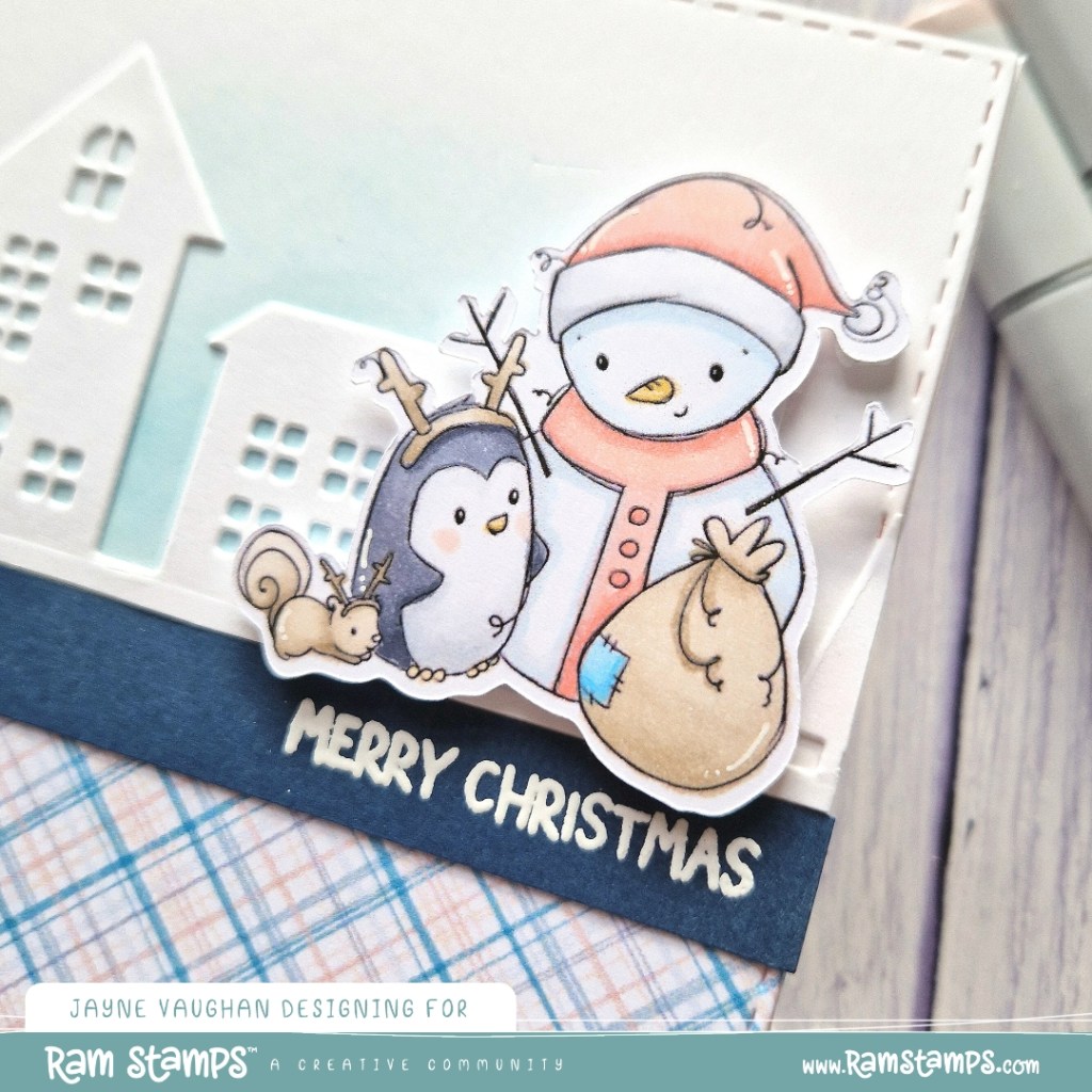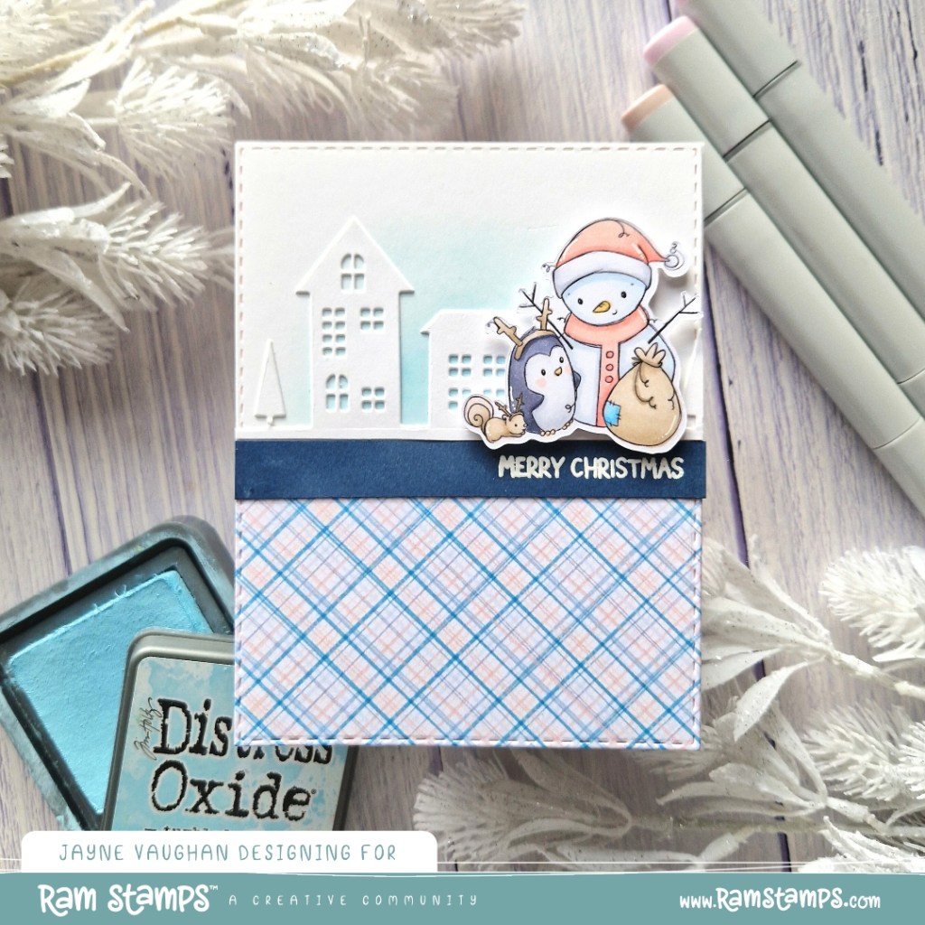 Today, I’m sharing a card I made with the Penguin & Snowman: Santa Snowman digital stamp from this month’s RAM Stamps release. I also wanted to use one of the new digital papers from the Snowy Christmas digital paper pack on the bottom half of my card, so I chose Copic colours for my image that would co-ordinate.