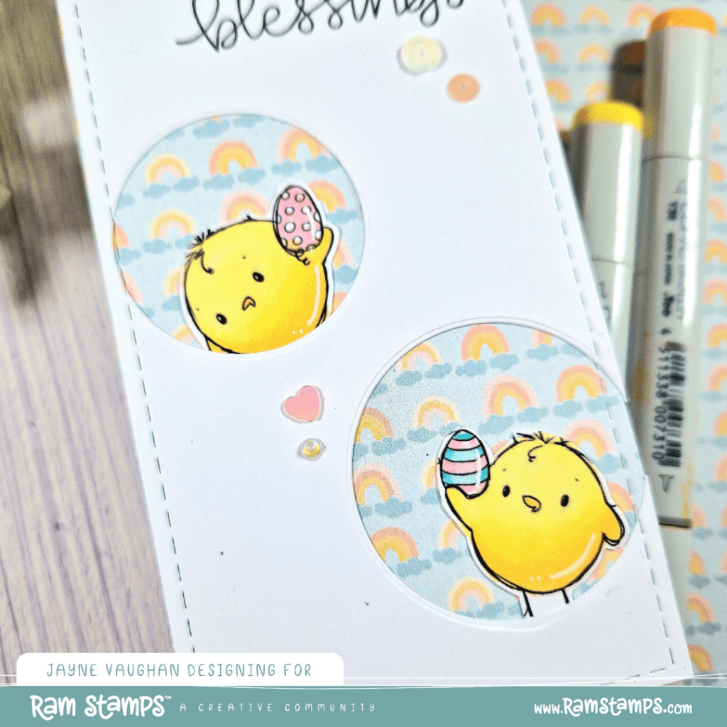 I used Waffle Flower’s Additional Circles dies to cut three circles in my white panel, then glued it on top of the patterned paper. I then added a chick into each of the circles.