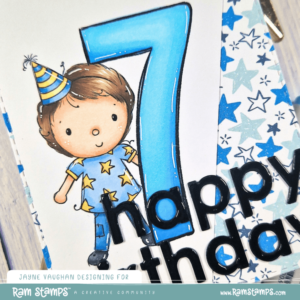 The first card I’ve made with the release is for my daughter’s best friend. They’ve been thick as thieves since they were born (I met his mum at antenatal classes!) and I can’t believe how old they now are! I used the “Happy Birthday Creator – Characters” stamp combined with the “Happy Birthday Creator – Numbers” stamp for my scene. I resized the “7” from the Numbers set to be as large as the boy character, and in Word I used the “bring to front” option, so it looked like my boy character was peeking out from behind the number.