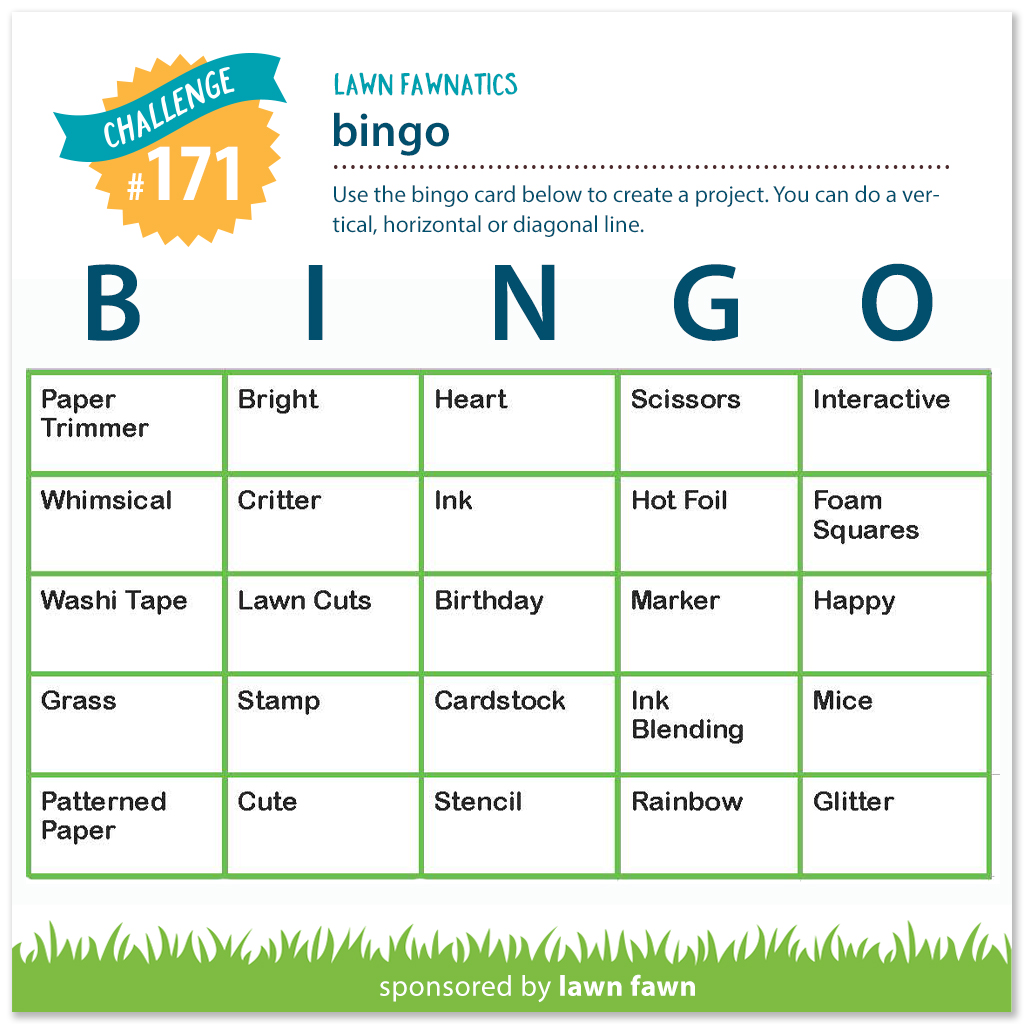 I really enjoyed making this card for the current Lawn Fawn challenge. They’ve got a fun BINGO board, where you can choose any column, row or horizontal line to use as your parameters/criteria – I chose Column I which was “cute, critter, bright, stamp, and Lawn Cuts”.