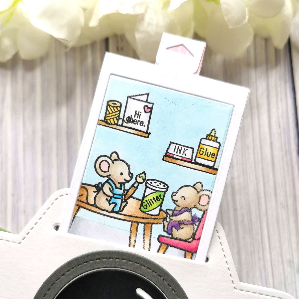 I assembled the polaroid image by gluing the frame and image to some scrap paper. I then made the pull tab by folding it over some of the pink patterned paper with white card underneath for strength, then added the tab to the back of the polaroid image. I slotted the polaroid into the horizontal opening and flipped the card over. I added some thin foam tape strips around the edges of the card and on each side of the horizontal opening, so that the polaroid would have a channel to move up and down in.