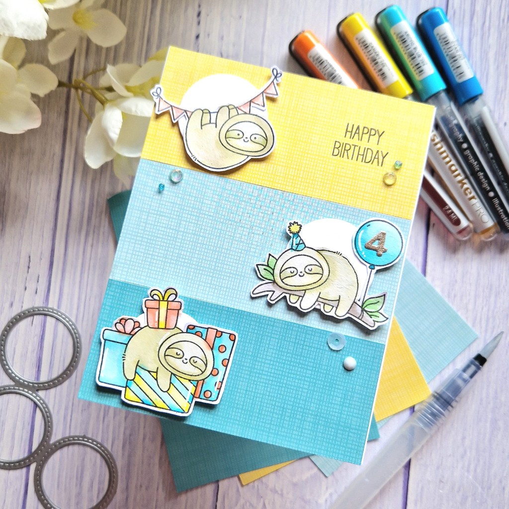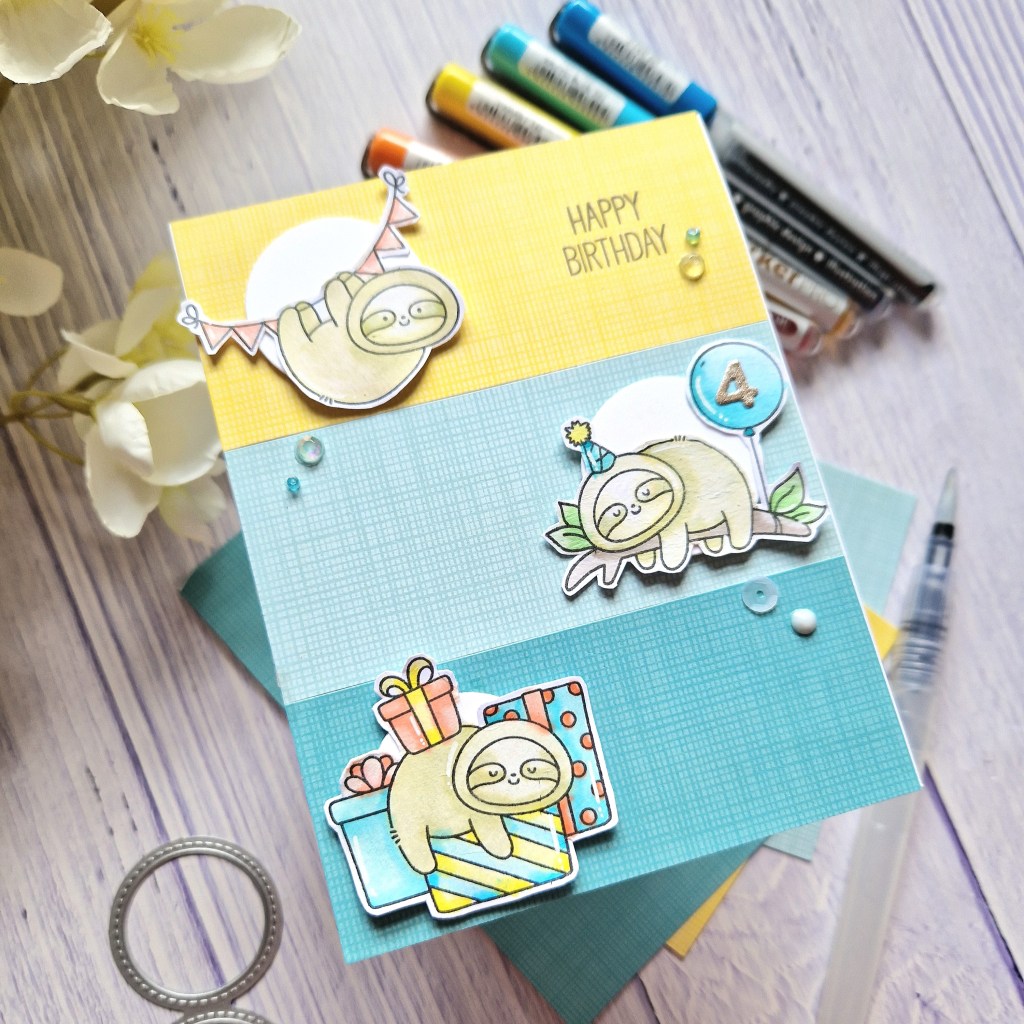 Next, I stamped out three of the images from the Jenoblade Hang out and Celebrate stamp set, and watercoloured them with Karin Makers. To match the colours from the challenge palette, the markers I used were Arctic Blue, Canary, Turquoise and Orange Red. Once dry, I fussy cut them and added them to the circles with liquid glue, then added the entire panel to an A2 card base with tape runner.