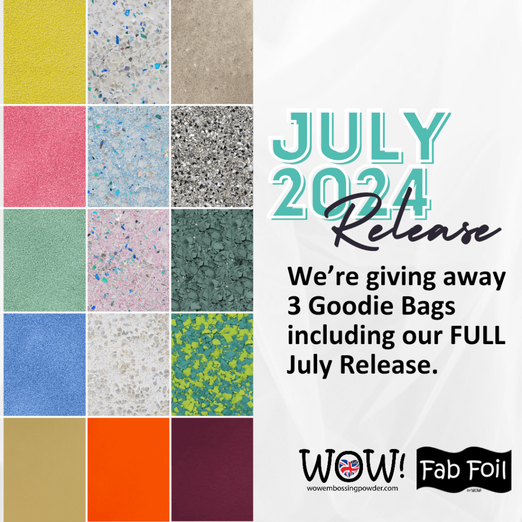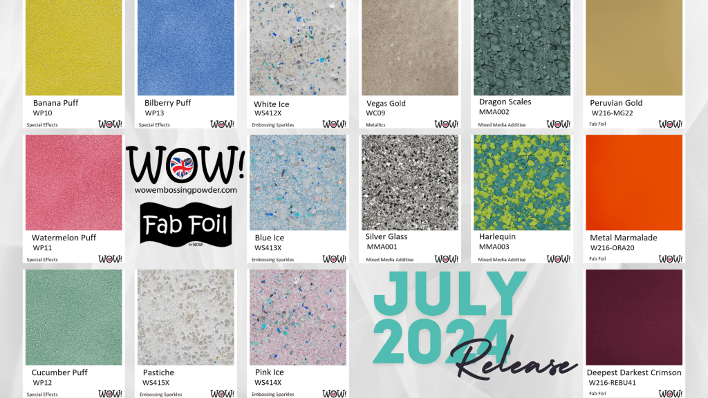 I’m excited to be joining WOW Embossing Powder to celebrate their July 2024 release! It’s a BUMPER release, filled with Embossing Sparkles, Fab Foils and even a completely NEW product line; Mixed Media Additives!