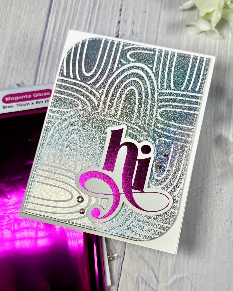 For my card, I’ve used the new Microdot hot foil, as well as the Magenta Gloss hot foil, to create a bold card that packs a punch! I used two hot foil plates from Erin Lee Creative – the arches background plate, and the “hi” sentiment. I have a Gemini Foil press and the new hot foils worked a dream with it – even for a complete beginner to foiling, like me! They foiled absolutely beautifully – in fact, this panel was created with the “leftover” foil after I’d already used the arches plate to create one foiled panel. I used the negative and foiled that onto a second piece of card, so there was no waste – one plate, one piece of foil, two cards!