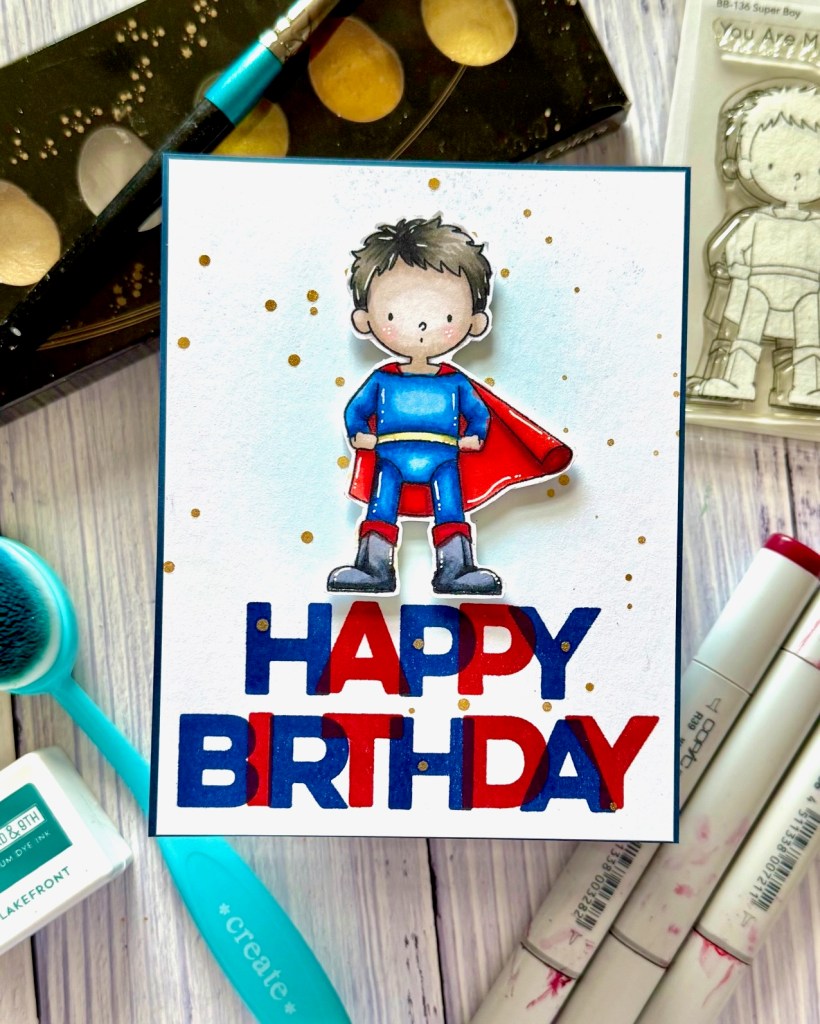 I fussy cut my superhero, and added him with foam tape on top of the sentiment. Finally, I trimmed a small amount from the edges of the card panel and added it onto a navy blue A2 card panel.